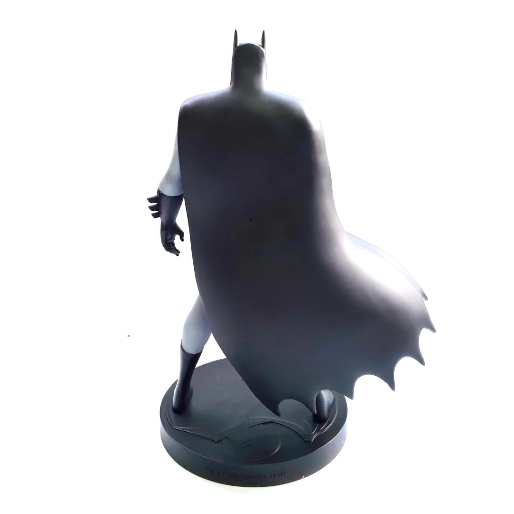 O Batman está representado em uma pose digna e confiante, segurando sua capa elegantemente. A capa, esculpida com detalhes delicados, parece estar fluindo ao vento, adicionando dinamismo à cena e capturando a essência do vigilante noturno em ação.