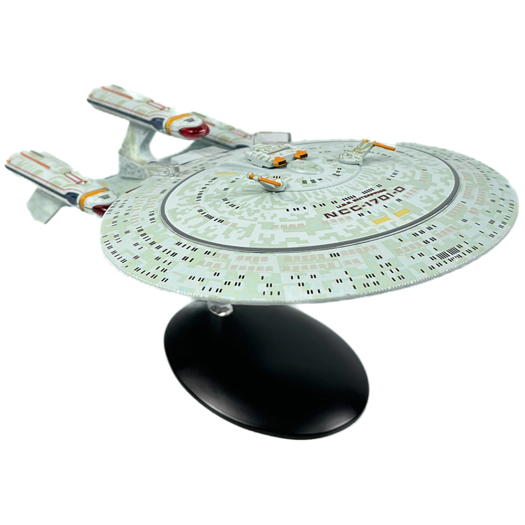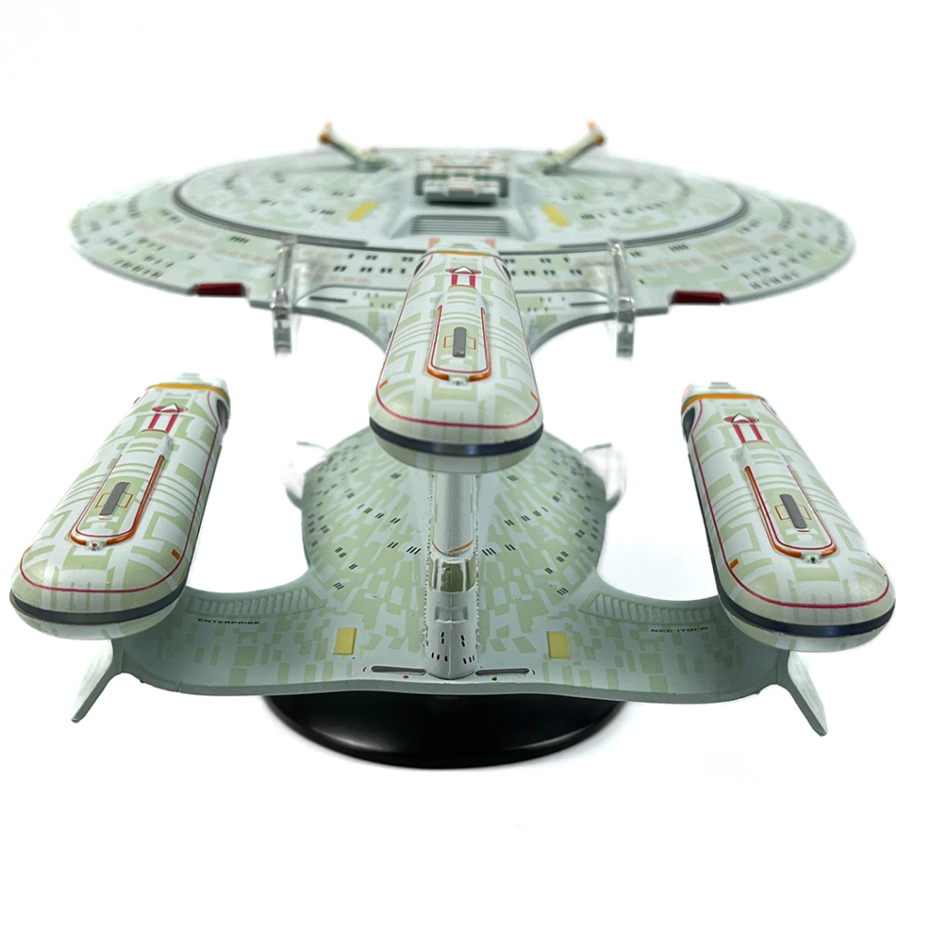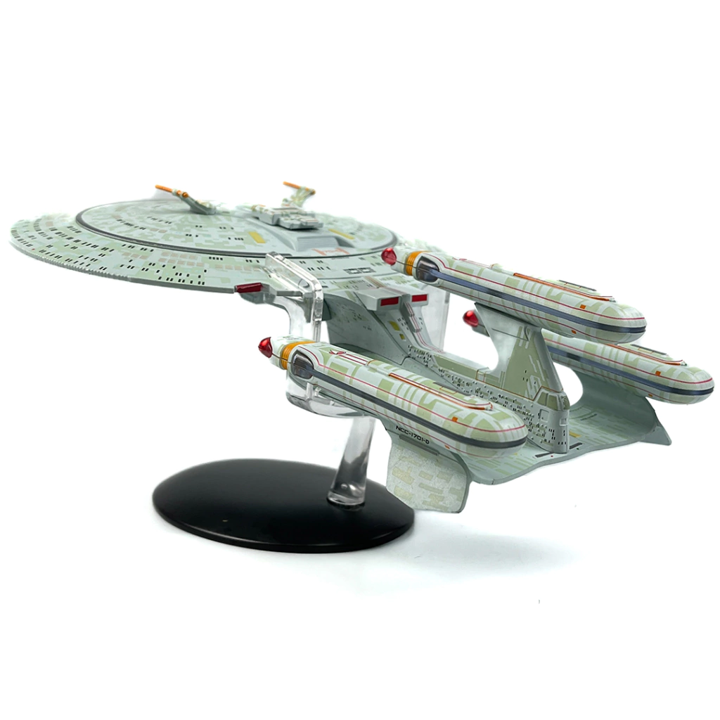 A nave U.S.S. Enterprise NCC-1701-D Dreadnought (All Good Things) recria as USS Enterprise-D em Star Trek Official Starship Collection como visto no amado final de The Next Generation "All Good Things"! Este modelo de nave espacial de tamanho gigante da U.S.S. Enterprise NCC-1701-D dá vida à Enterprise em tamanho XL, como mostrado no futuro alternativo distante revelado a Picard por Q. Nesse futuro antimotim, a Enterprise-D sobreviveu à batalha por Veridian III e tornou-se a capitânia pessoal do almirante Riker. A Enterprise passou por atualizações significativas para se manter viável como parte do conflito da Frota Estelar com o Império Klingon, incluindo a adição de uma terceira nacele, nova tecnologia de camuflagem e uma poderosa lança espinhal phaser montada sob seu pires. Seu modelo da variante dreadnought da U.S.S. Enterprise NCC-1701-D foi meticulosamente recriada em material fundido, com extraordinária atenção aos detalhes, capturando a aparência atualizada dos naves e as três nacelas. Esse design de variante seria apelidado de Galaxy-X e se tornaria um reaparecimento generalizado à medida que as hostilidades de Klingon se intensificam.