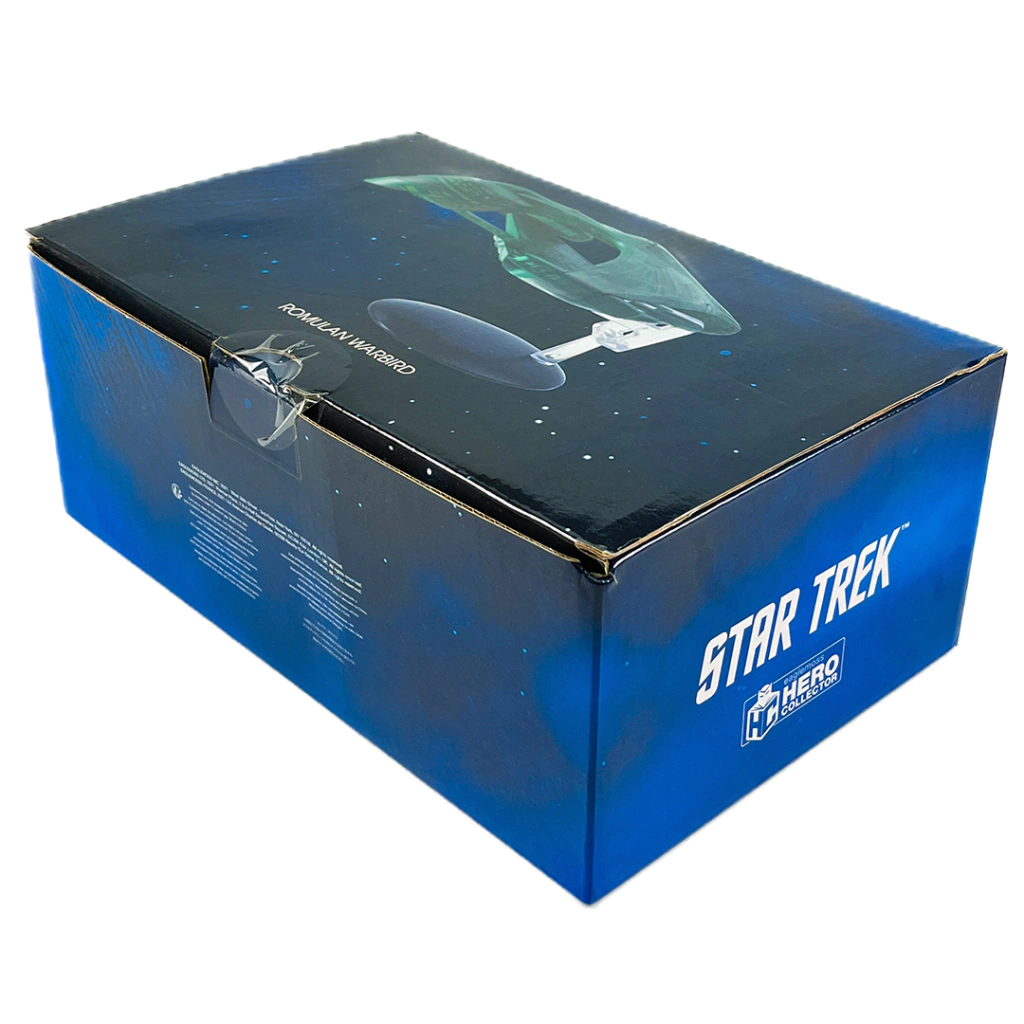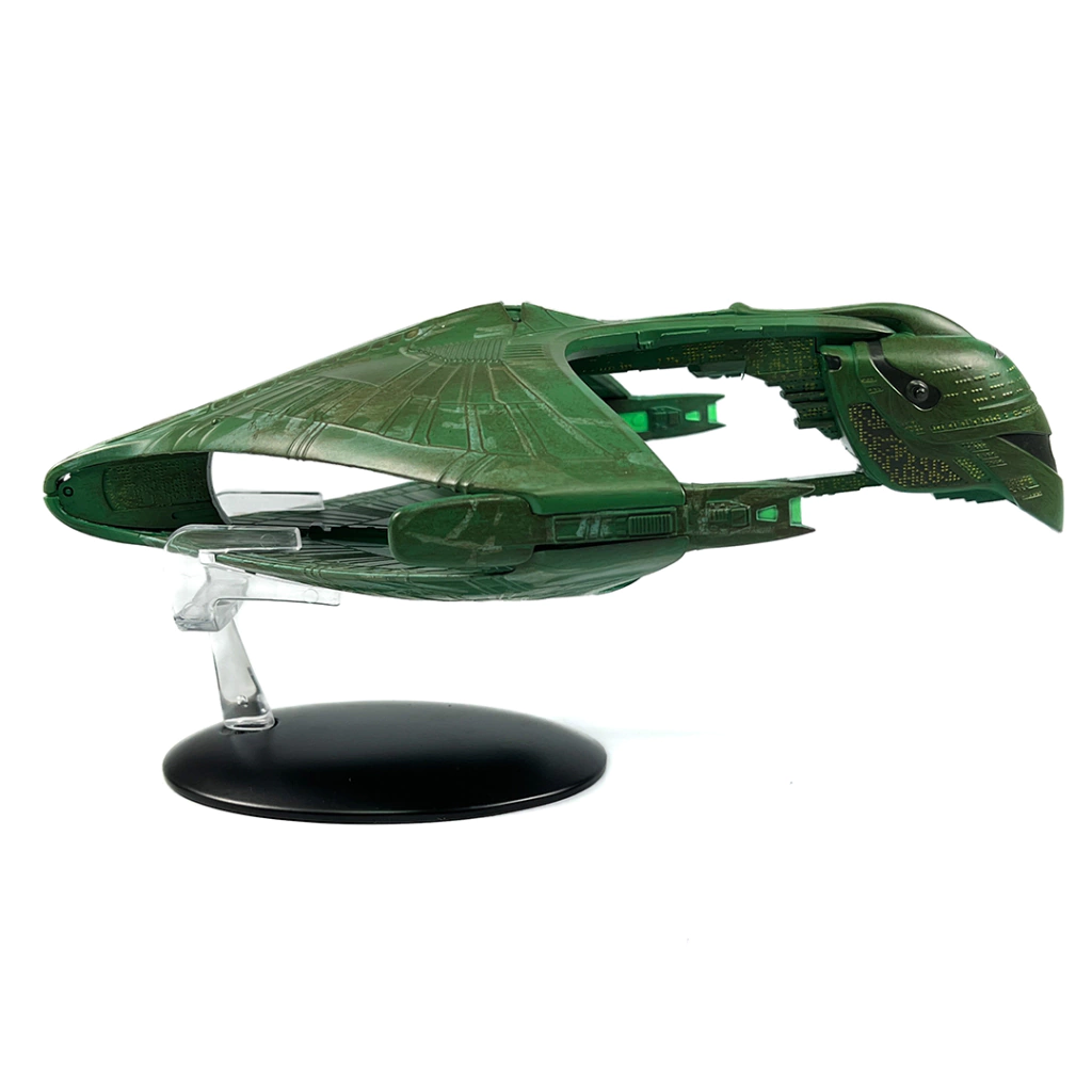 A próxima nave Star Trek: The Official Starships Collection BIG SHIP é a Romulan Warbird, uma nave da classe D'Deridex que constituía a maior parte da Frota Romulana no século 24. O Romulan Warbird foi a principal cruzador de batalha do Império Romulano Star durante a segunda metade do século 24. Ele apareceu pela primeira vez no episódio de The Next Generation "The Neutral Zone", sinalizando o fim do isolamento romulano. O Romulan Warbird foi uma das coisas mais importantes que Andrew Probert projetou durante a primeira temporada de TNG, onde deu a STAR TREK um visual totalmente novo. Este fantástico modelo do Romulan Warbird foi meticulosamente recriada em molde com extraordinária atenção aos detalhes, capturando o design do casco em "concha" dividido horizontalmente com um longo "pescoço" e "cauda". As asas divididas são conectadas por naceles de urdidura em ambos os lados, em uma bela cor verde esmeralda.